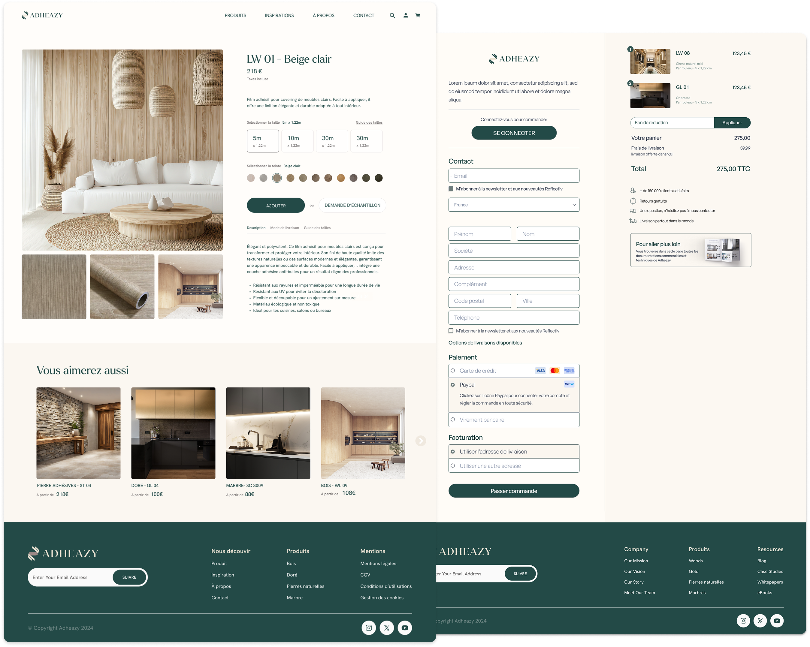Adheazy is a newly launched brand created by my former employer, specializing in high-quality covering films used to wrap furniture. These films come in a variety of finishes, such as wood, marble, metal, and concrete effects. During my internship, I was tasked with creating the mockups, wireframes, and prototypes for the brand’s upcoming e-commerce website, which is not yet live. The primary goal was to showcase this new brand and its products while developing a modern and elegant platform to attract customers.